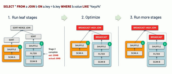 ๊ทธ๋ฌ๋ AQE ๋ ์คํ์ค์ ์์งํ ๋ฐ์ดํฐ ์ ๋ณด๋ฅผ ๋ฐํ์ผ๋ก ์ค๊ฐ์ Join ์ ๋ต์ ๋ณ๊ฒฝํ ์ ์๋ค.